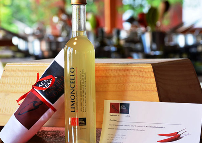 Acompanha 2 aventais e uma garrafa do nosso Limoncello artesanal! Aventais e limoncello poderão ser retirados na escola no momento da aula escolhida pelo presenteado.