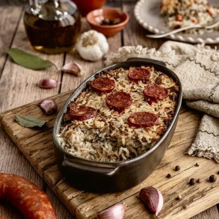 • Arroz de Pato (saboroso, aromático e tradicional arroz cozido no caldo do pato, servido com o pato cozido e linguiça);